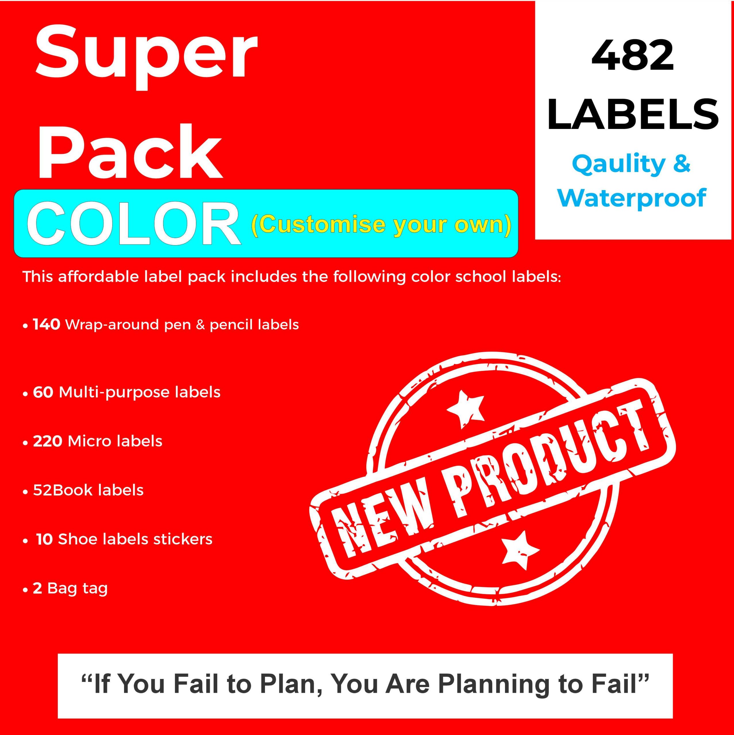 Our super pack is specially designed to suit those parents whose children need a large variety of school labels; it contains a great mix of vinyl name labels and clothing labels, ensuring that nothing will get lost in the chaos of school. It is everything you will need in one large label pack perfect for; new uniforms, stationary, bags, lunch boxes and shoes. This is a great one for Foundation Phase learners who require a lot of pens and pencils.